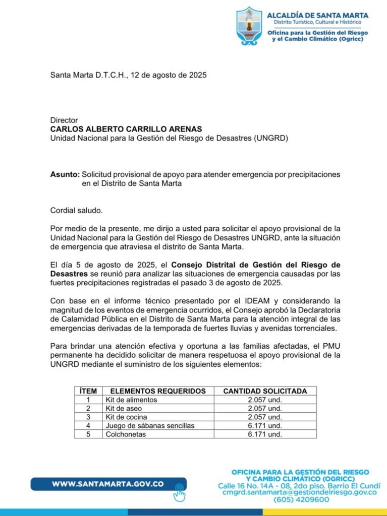 A través de su cuenta en X, el mandatario distrital publicó la carta radicada el 12 de agosto ante la UNGRD, en la que solicitó apoyo para enfrentar la calamidad pública que atraviesa la ciudad. “En el marco de la emergencia invernal (…) solicitamos apoyo a la @UNGRD y hoy es una realidad. Agradezco al Gobierno Nacional por atender nuestra solicitud y tenderle la mano a los samarios afectados”, escribió.