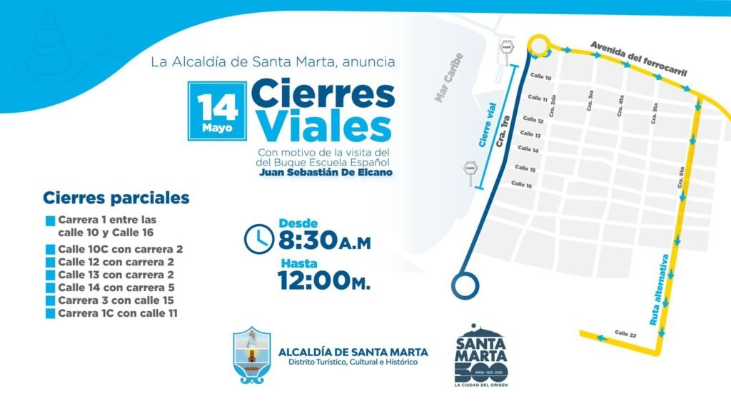 La Carrera Primera, que bordea el camellón de la Bahía y suele ser arteria vital del centro samario, será cerrada al tráfico desde las 8:30 de la mañana hasta el mediodía, específicamente desde el parqueadero de la Sociedad Portuaria hasta la Calle 16. Esta franja horaria concentrará los principales actos oficiales con la realeza y la tripulación del buque, que llega en el marco de una gira internacional.