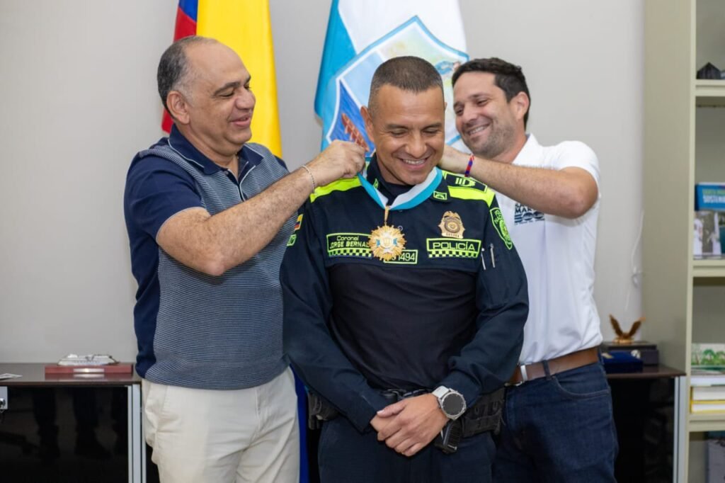 El alcalde de Santa Marta Carlos Pinedo Cuello, entregó al coronel Jorge Andrés Bernal Granada dos importantes condecoraciones como reconocimiento a su labor al frente de la Policía Metropolitana de la ciudad.